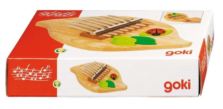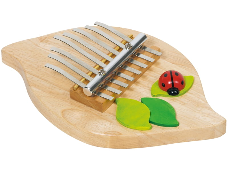 Śliczna kalimba od Goki, z biedroneczką i zielonymi listeczkami. Można na niej grać obiema dłońmi, używając do grania kciuków lub palców wskazujących. 8 dżwięków gama C-dur
